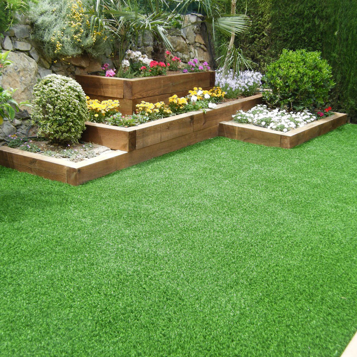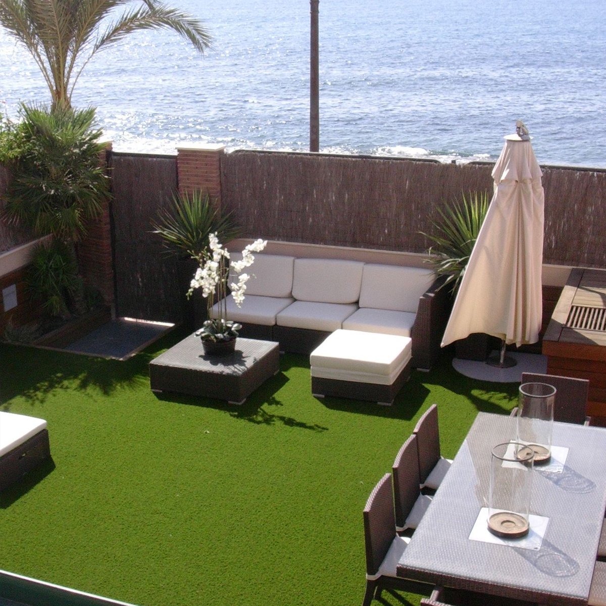 Grama artificial de fibras suaves y extremadamente resistentes al uso. No requiere de riego, fertilización o corte.